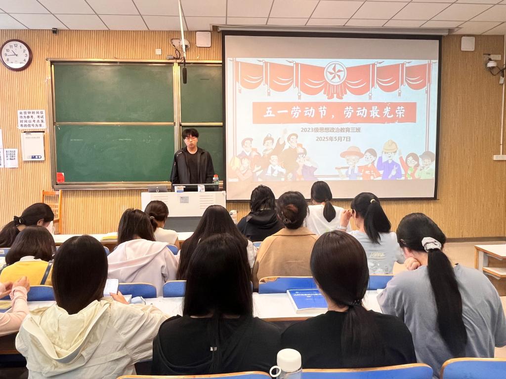 为弘扬劳模精神,发扬劳动传统,5月7日上午,pp电子官方网站2023级思想政治教育三班在社科楼515召开“五一劳动节,劳动最光荣”主题班会。pp电子官网2023级思想政治教育三班全体同学共同参与本次班会,班会由团支书郝瀚主持。