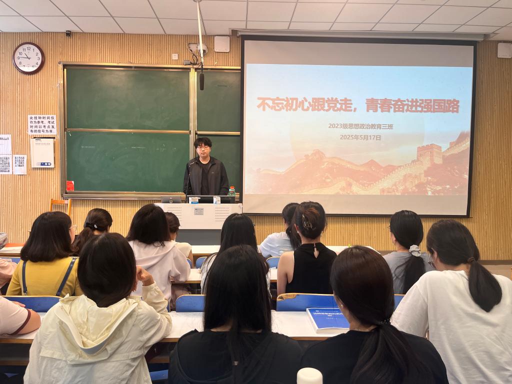 为弘扬伟大建党精神,走好新时代赶考之路,5月17日上午,pp电子官方网站2023级思想政治教育三班在社科楼515召开“不忘初心跟党走,青春奋进强国路”主题团课。pp电子官网2023级思想政治教育三班全体同学共同参与本次团课,团课由团支书郝瀚主持。