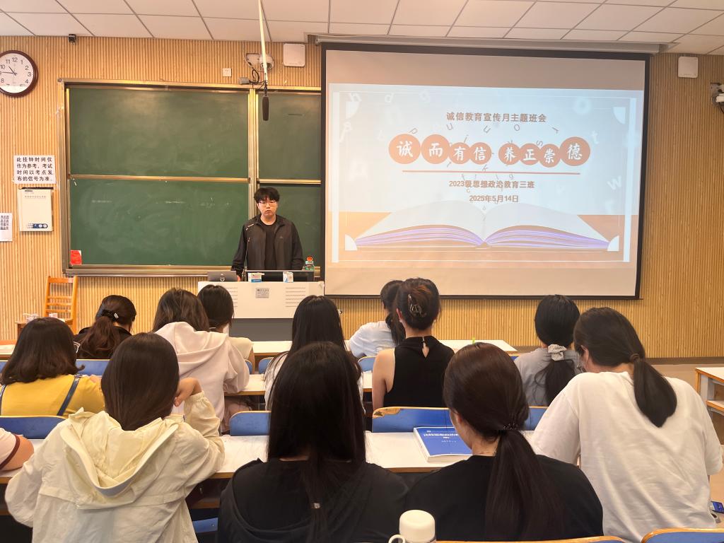 为践行社会主义核心价值观,弘扬诚信精神,5月14日上午,pp电子官方网站2023级思想政治教育三班在社科楼515召开“诚而有信,养正崇德”主题班会。pp电子官网2023级思想政治教育三班全体同学共同参与本次班会,班会由团支书郝瀚主持。