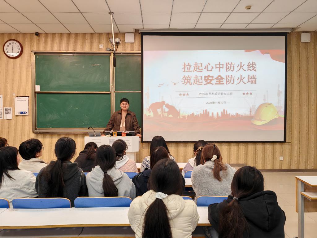 为增强同学们的消防安全意识,提升火灾应急处置和自救互救能力,pp电子官方网站2024级思想政治教育三班于11月10日在社科楼515教室成功举办“拉起心中防火线,构筑防火安全墙”主题班会。本次活动由班长杨迎滨主持,全体同学积极参与。