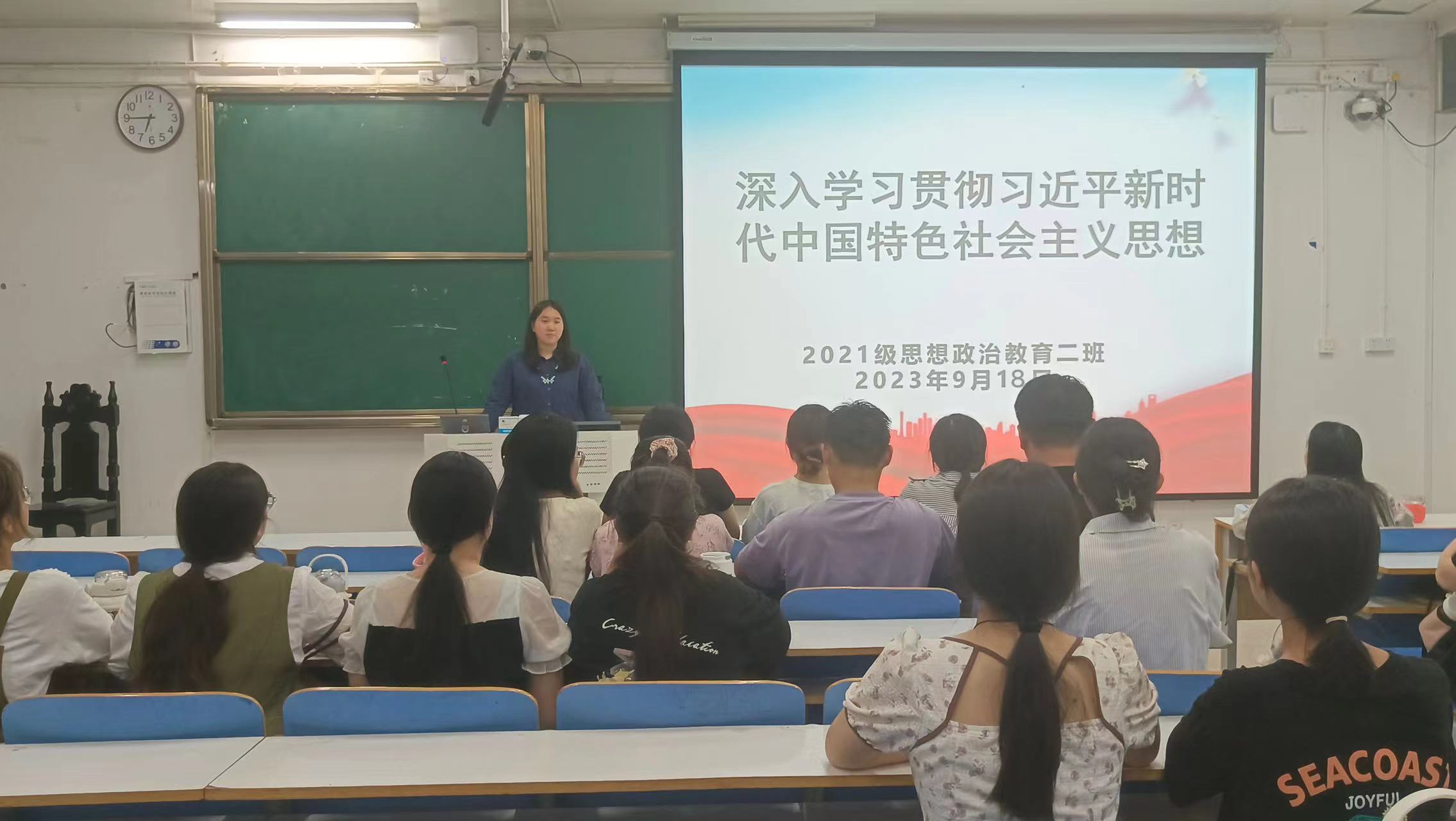 9月18日下午,pp电子官方网站2021级思想政治教育二班在社科楼514教室召开“深入学习贯彻习近平新时代中国特色社会主义思想”主题团课。2021级思想政治教育二班全体团员参加此次团课。团课由团支书王婧欣主持。