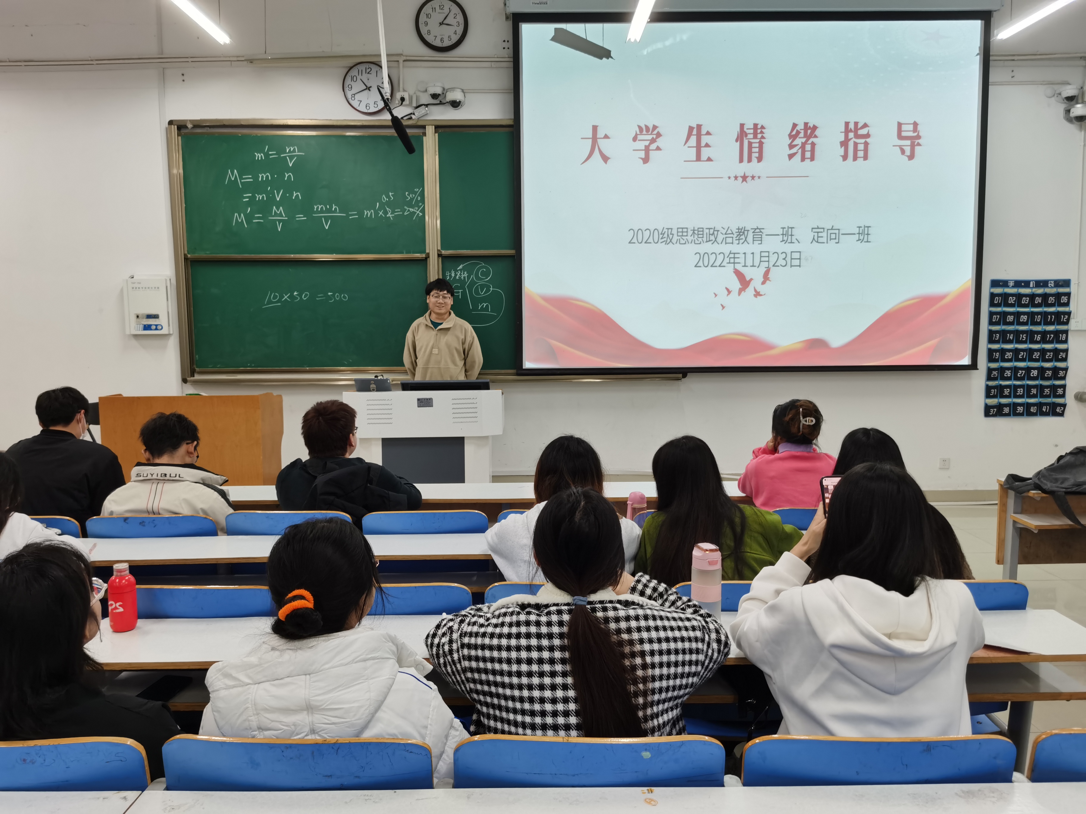 11月23日下午,pp电子官方网站2020级思想政治教育一班、定向一班在社科楼415教室顺利举办“大学生情绪指导”心理班会。pp电子官方网站2020级思想政治教育一班、定向一班全体学生聆听了此次班会,班会由心理委员王旭主持。