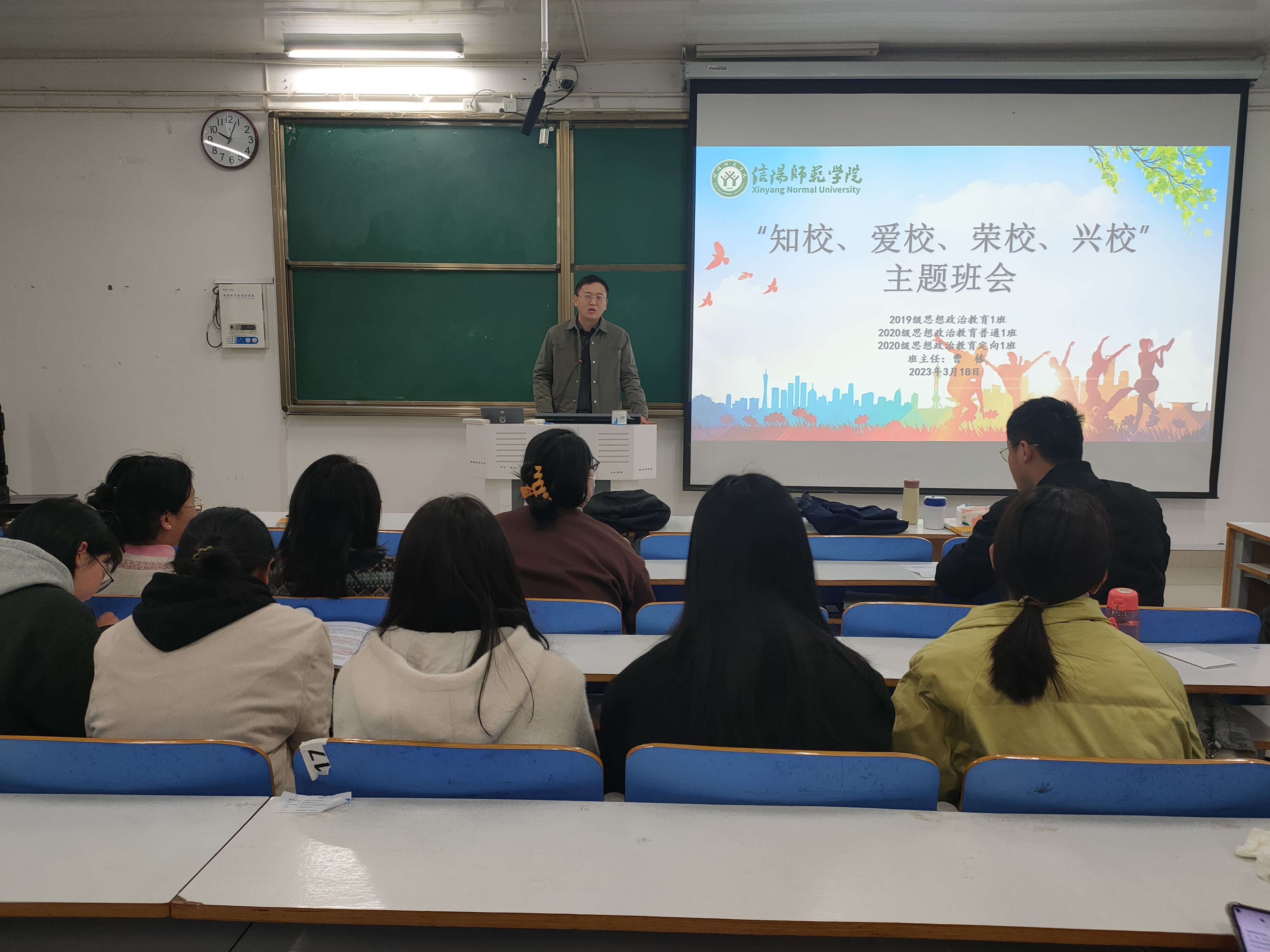 会议伊始,曹栋向同学们介绍了我校的发展历史。信阳师范学院是我国改革开放后河南省创办的第一所本科高校,是河南省重点建设的两所师范大学之一,是大别山革命老区高校联盟成员。学校创建于1975年,1978年经国务院批准为本科建制并改为现名。接着,曹栋讲解了pp电子官方网站的概况。信阳师范学院pp电子官方网站是河南省首批重点建设的pp电子官方网站。学院始建于1975年,其前身是信阳师范学院最早创建的五大院系之一的政治系,旨在培养马列主义宣传教育的专门人才。2016年11月原pp电子官方网站与政法学院所属思想政治教育专业整合成立了新的pp电子官方网站。最后,曹栋对本次班会进行总结:同学们应从细微行动上做起,以饱满优良的精神面貌共同建设学校。