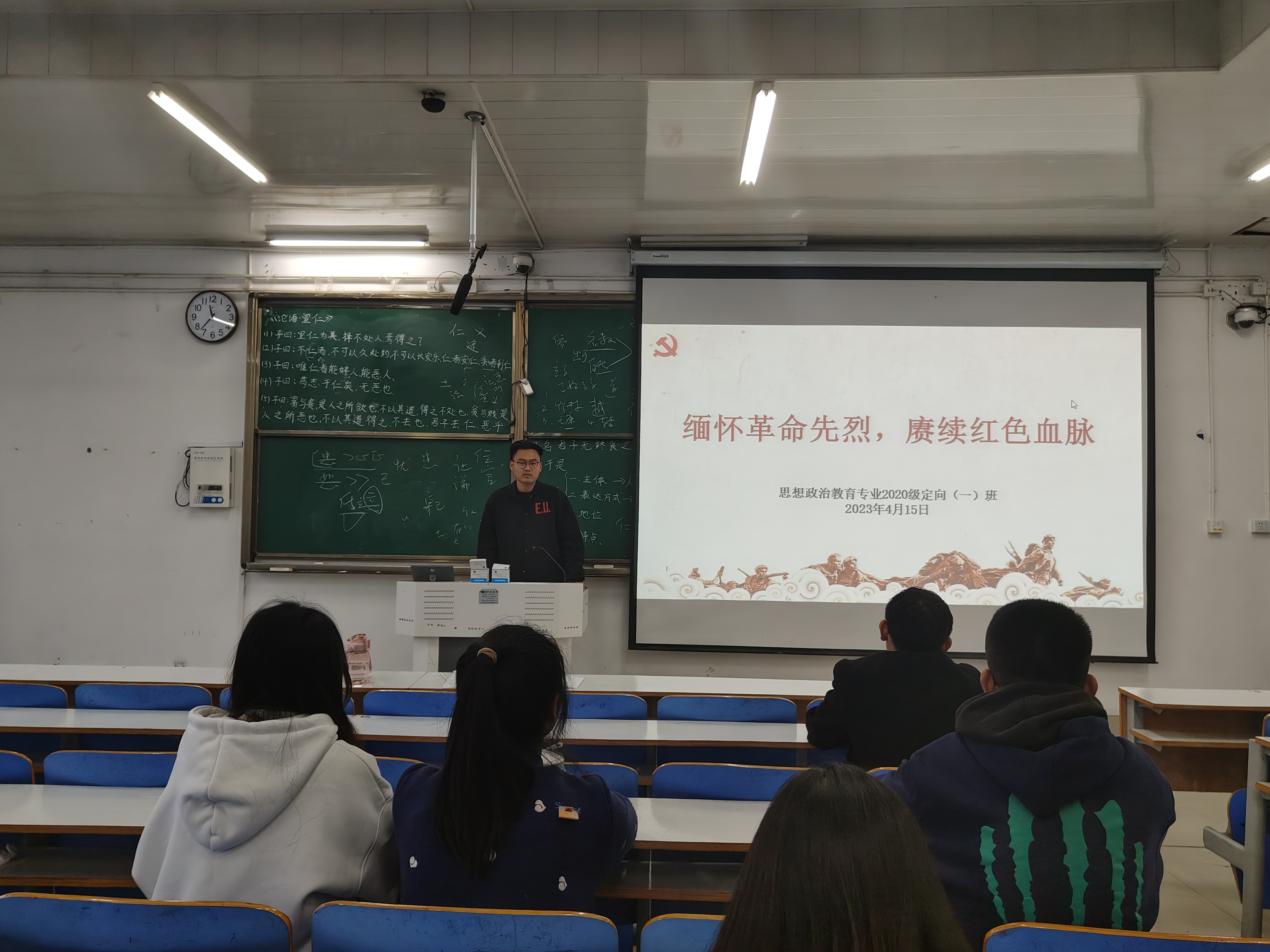 4月15日下午,pp电子官方网站2020级思想政治教育定向一班在社科楼515教室顺利举行了缅怀革命先烈,赓续红色血脉主题团课。此次班会由团支书朱紫峰主持。