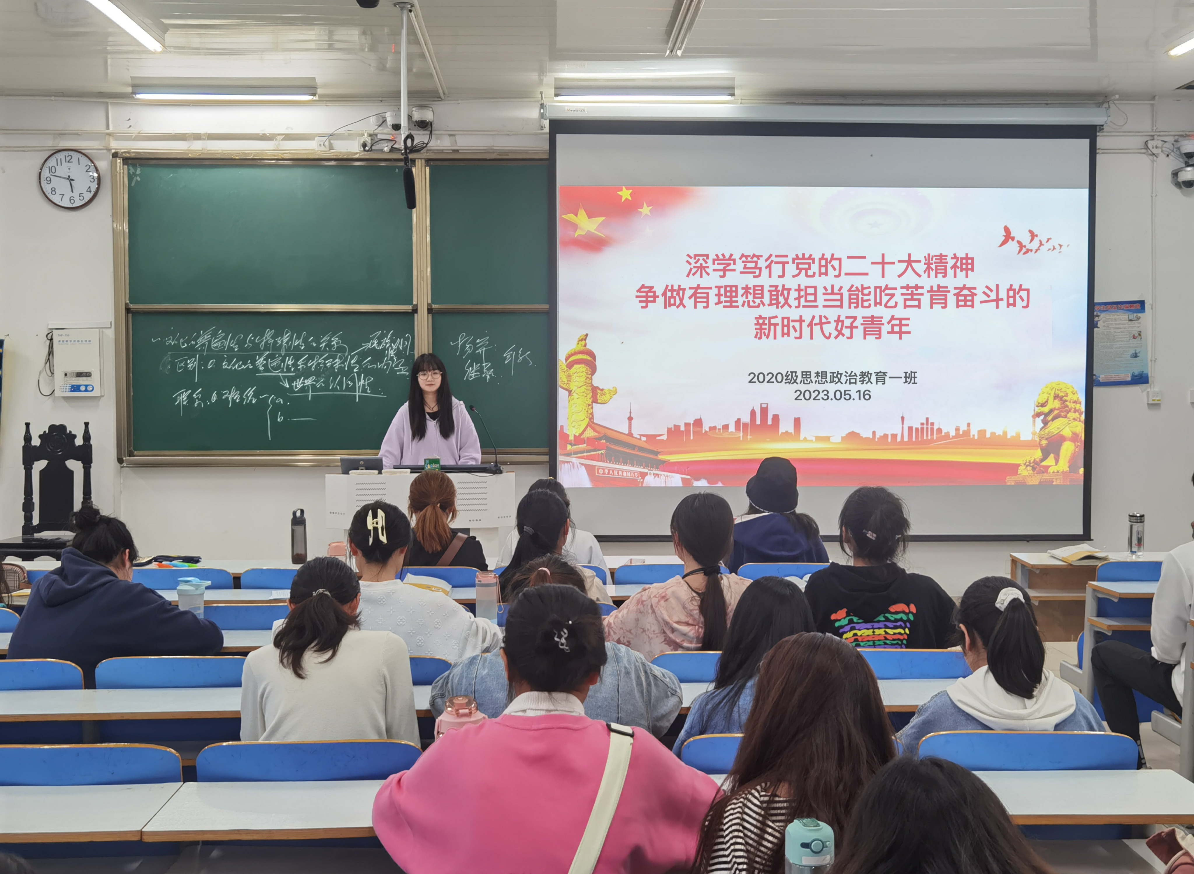 5月16日上午,pp电子官方网站2020级思想政治教育一班团支部在社科楼515教室召开“深学笃行党的二十大精神,争做有理想敢担当能吃苦肯奋斗的新时代好青年”主题教育活动。2020级思想政治教育一班团支部全体团员参加此次团课,团课由团支部书记卢茜雨主持。