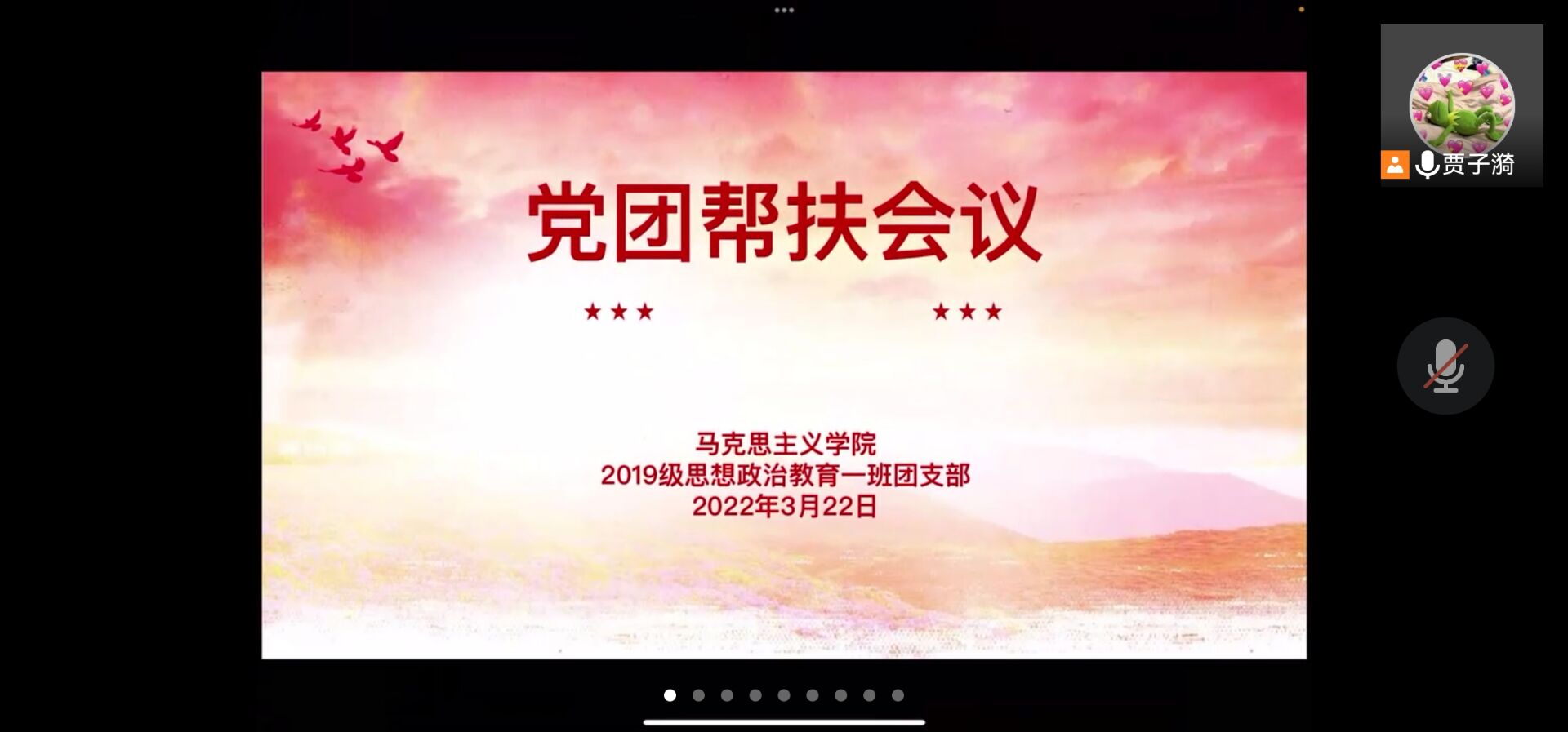 3月22日下午,pp电子官方网站2019级思想政治教育一班第一团支部在腾讯会议召开“党团携手·党团帮扶会”。pp电子官方网站2019级思想政治教育一班群体成员参加本次会议,会议由支书贾子漪主持。