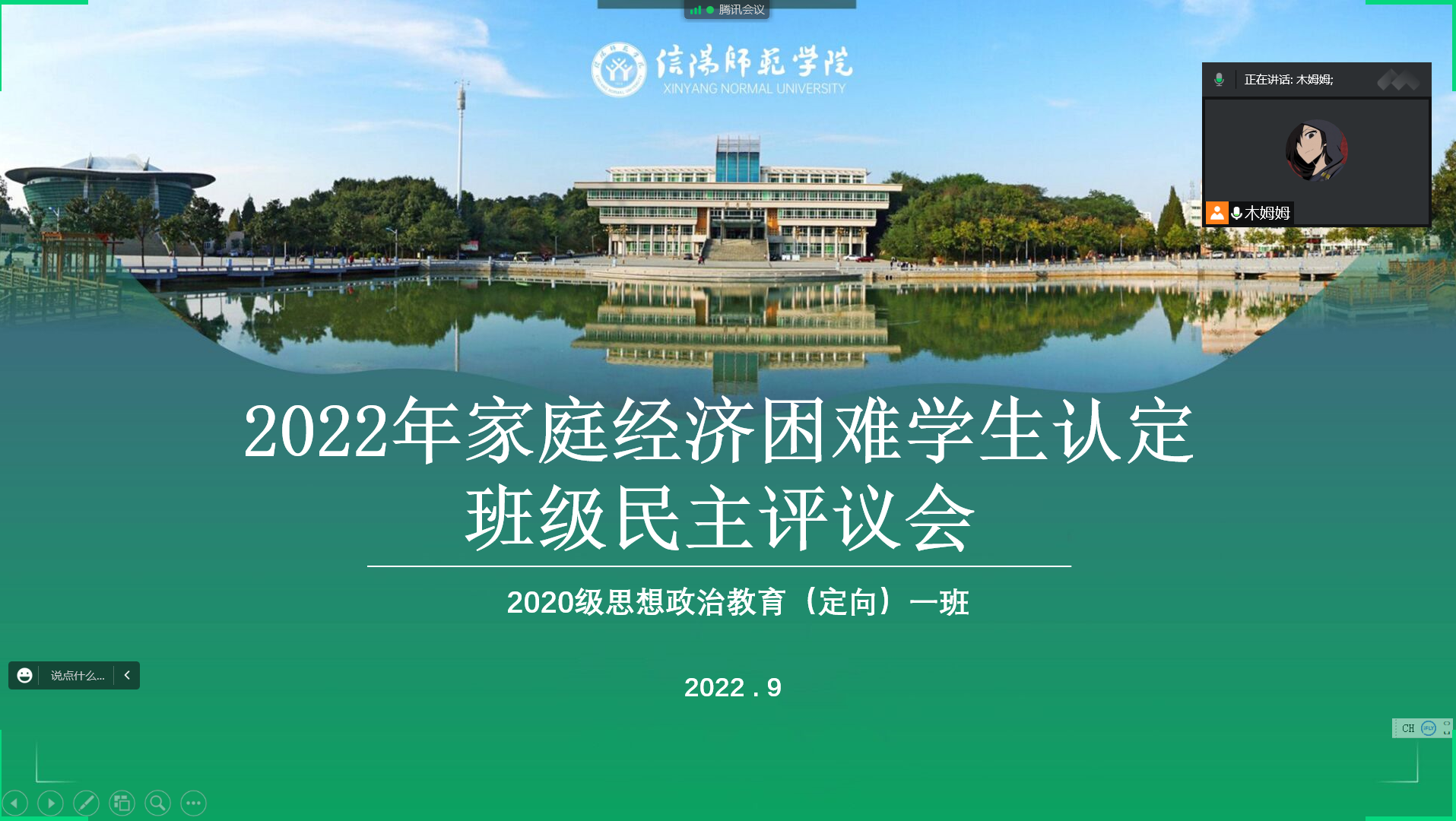 9月9日,pp电子官方网站2020级思想政治教育定向一班顺利举办2022年家庭经济困难学生认定班级民主评议会。本次会议采用线上与线下相结合的方式开展,定向一班全体学生参与了此次会议。