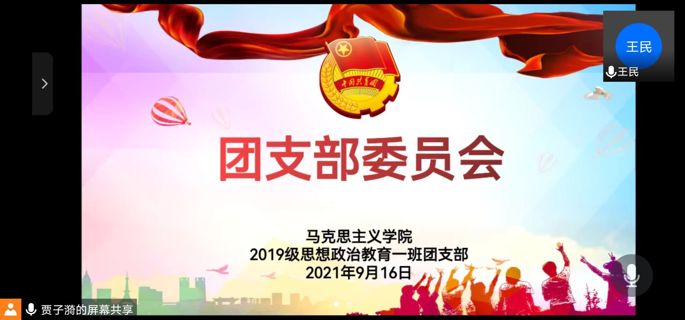 9月16日上午,pp电子官方网站2019级思想政治教育一班在腾讯视频召开团支部委员会。2019级思想政治教育一班团支委全体成员参加本次会议。会议由副班长王民主持。