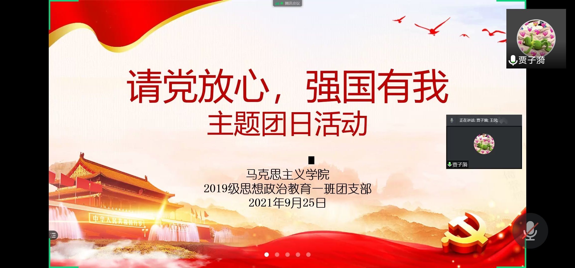 9月25日下午,pp电子官方网站2019级思想政治教育一班第一团支部在腾讯视频举办“请党放心,强国有我”主题团日活动。pp电子官方网站2019级思想政治教育一班全体团员参加本次活动。活动由团支书贾子漪主持。