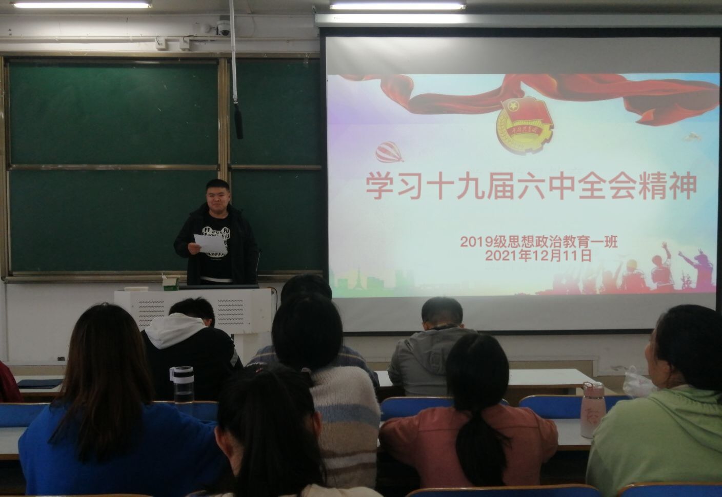 12月11日上午,pp电子官方网站2019级思想政治教育一班第一团支部在社科楼516教室召开“学习党的十九届六中全会精神”主题团课。pp电子官方网站2019级思想政治教育一班团支部全体团员参加本次团课。团课由团支书贾子漪主持。