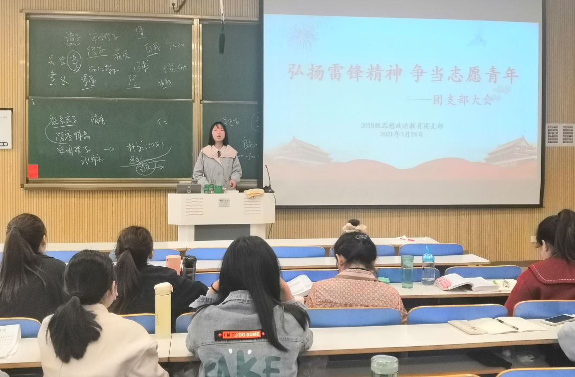 3月26日上午, pp电子官方网站2018级思想政治教育团支部在社科楼516教室顺利开展“弘扬雷锋精神,争当志愿青年”主题会议。2018级全体学生共同参加此次会议。会议由第一团支部书记靳雨露主持。