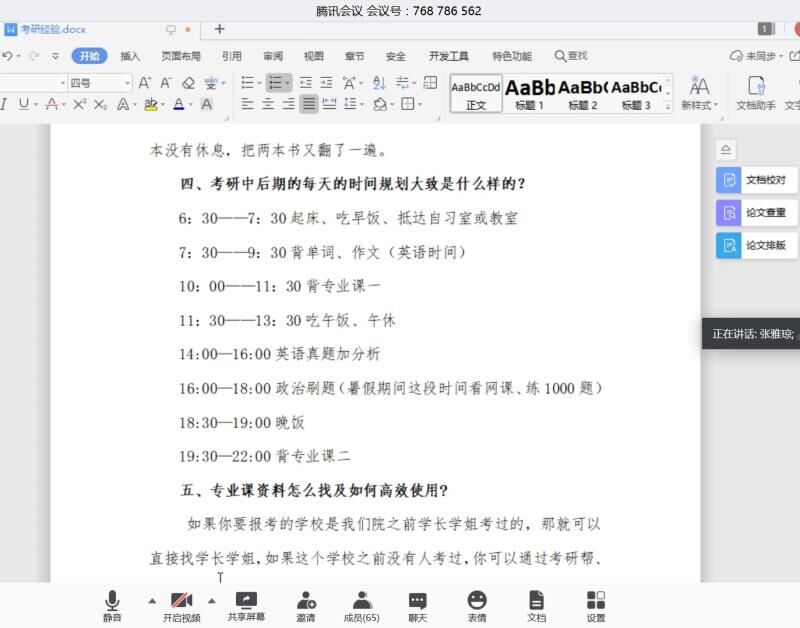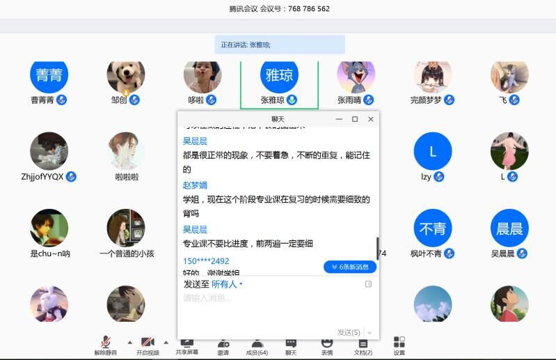 会上,三位学姐结合班级收集的备考疑惑,有的放矢地传授相关经验。刘玉林从专业课资料查找、提高复习效率两方面为切入点传授经验;张雅琼从英语、政治、专业课的资料查找与运用、备考感受、时间分配三方面分享自己的备考秘诀;吴晨晨结合自身经历为同学们提供选择报考学校及笔试答题的技巧。随后,问答环节中,各位同学积极踊跃在腾讯会议聊天框诉说备考疑惑。三位分享者条理清晰,层次明确,毫无保留地进行语音解答,提供有效帮助。