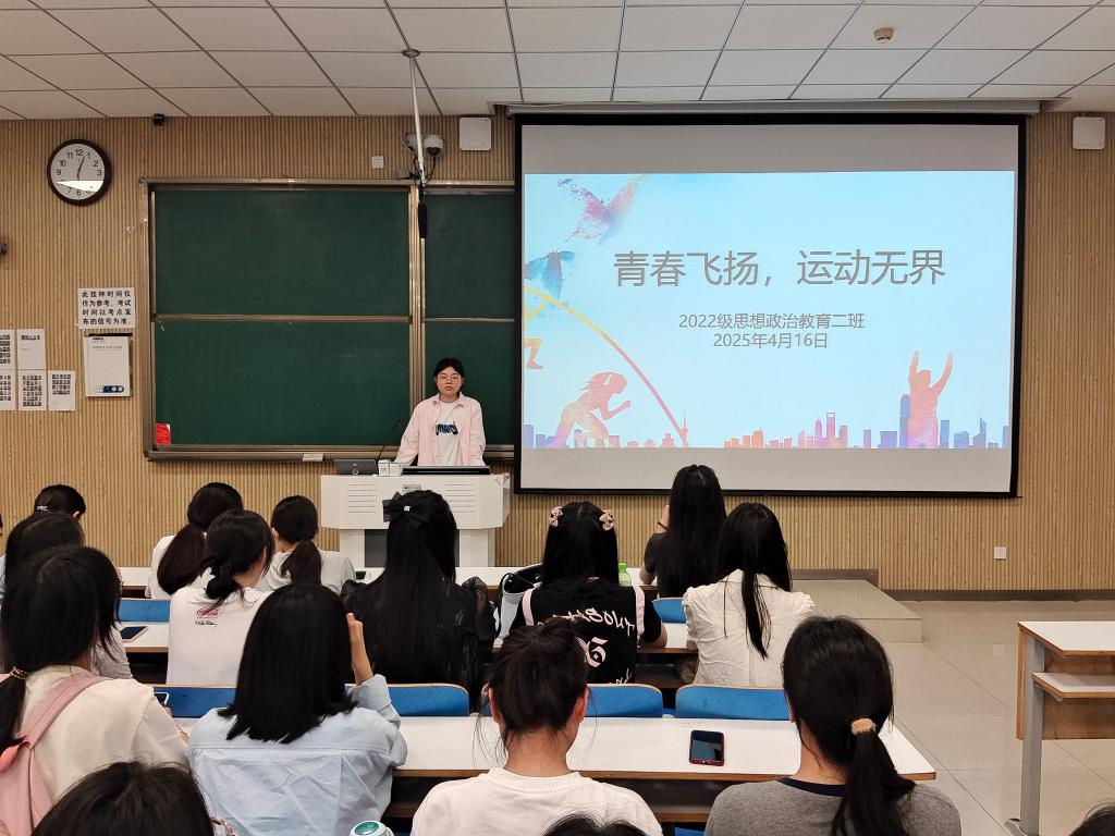 为进一步提高学生加强运动的意识,增强学生体质和综合素质,4月16日下午,pp电子官方网站2022级思想政治教育二班在社科楼515教室召开“青春飞扬,运动无界”主题班会。pp电子官网2022级思想政治教育二班全体成员共同参与此次班会。会议由副班长冯伟珈主持。