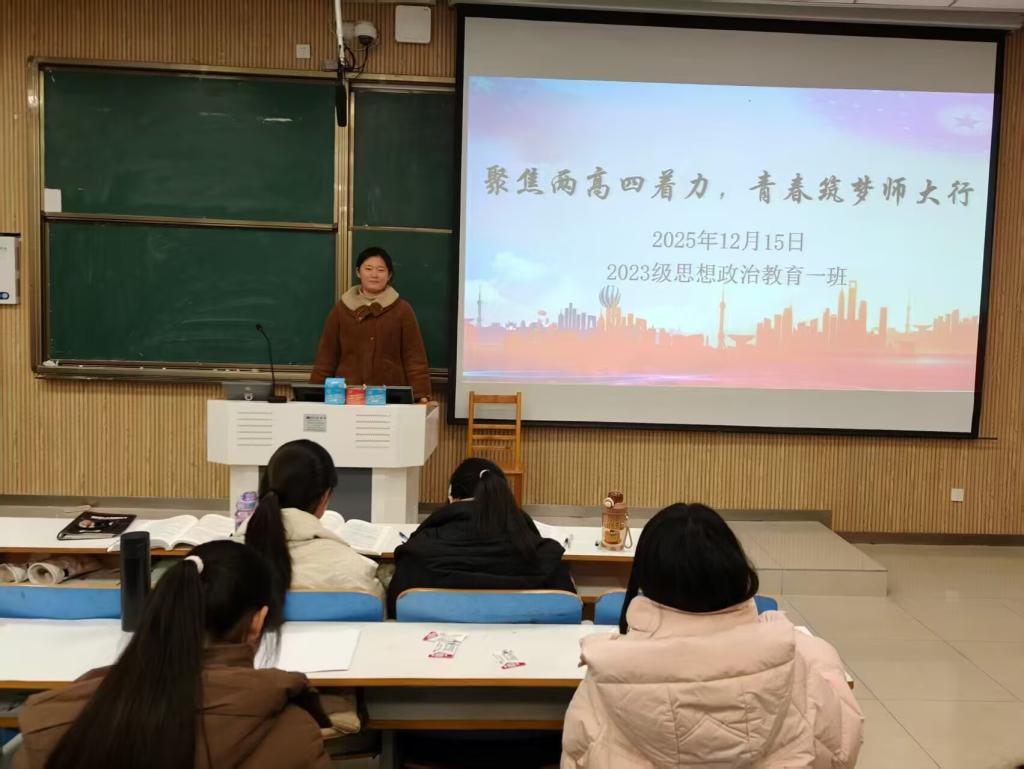 为深入贯彻“两高四着力”相关要求,引导班级学子将青春理想融入时代发展大局,强化师范生的使命担当,12月15日下午,pp电子官方网站2023级思想政治教育一班于社科楼515教室召开“聚焦两高四着力,青春筑梦师大行”主题团课。全班同学悉数参与,团课由团支书张卓主持。