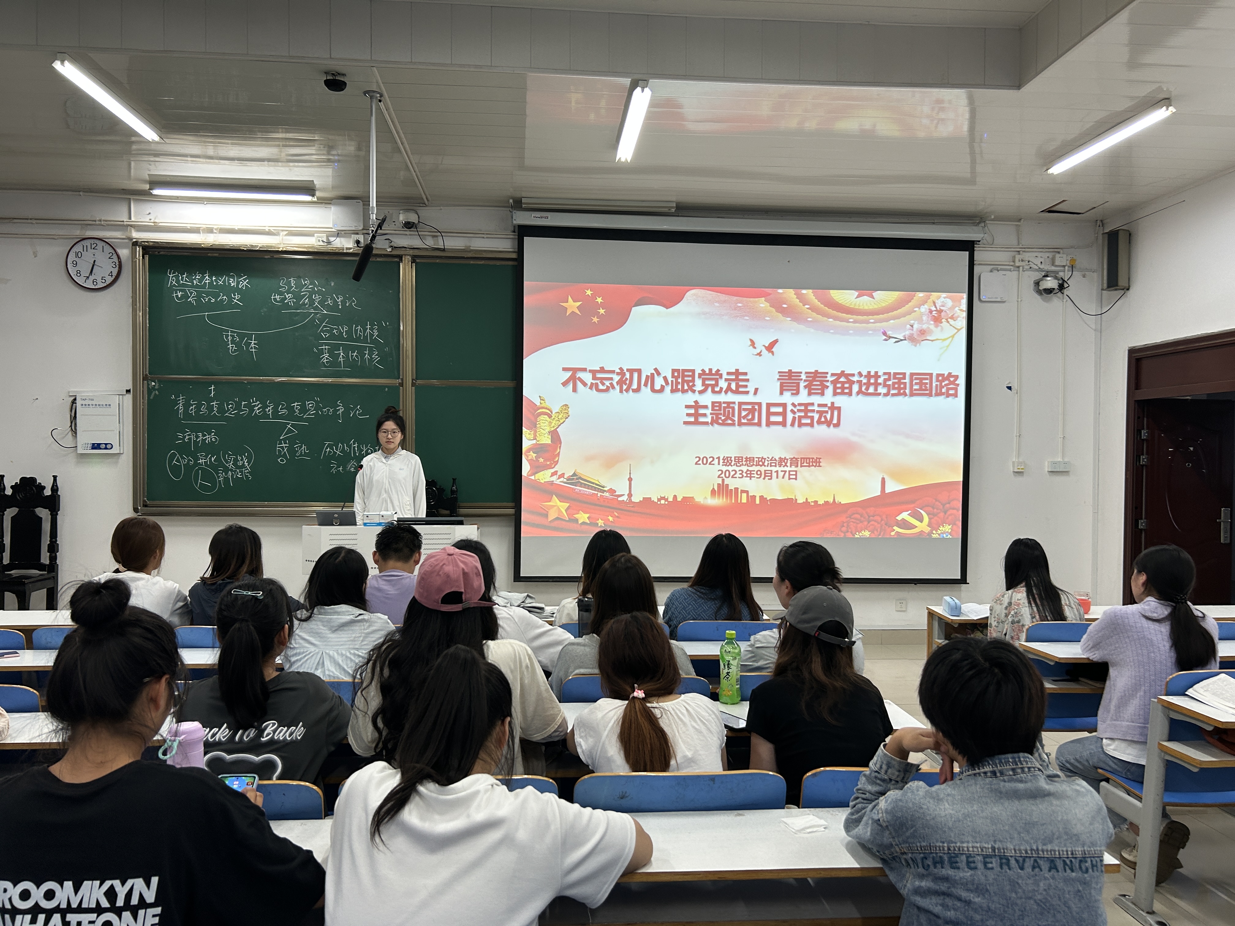9月17日下午,pp电子官方网站2021级思想政治教育四班在社科楼515教室召开“不忘初心跟党走,青春奋进强国路”主题团日活动。2021级思想政治教育四班全体团员共同参加本次团课。团课由团支书刘珂含主持。