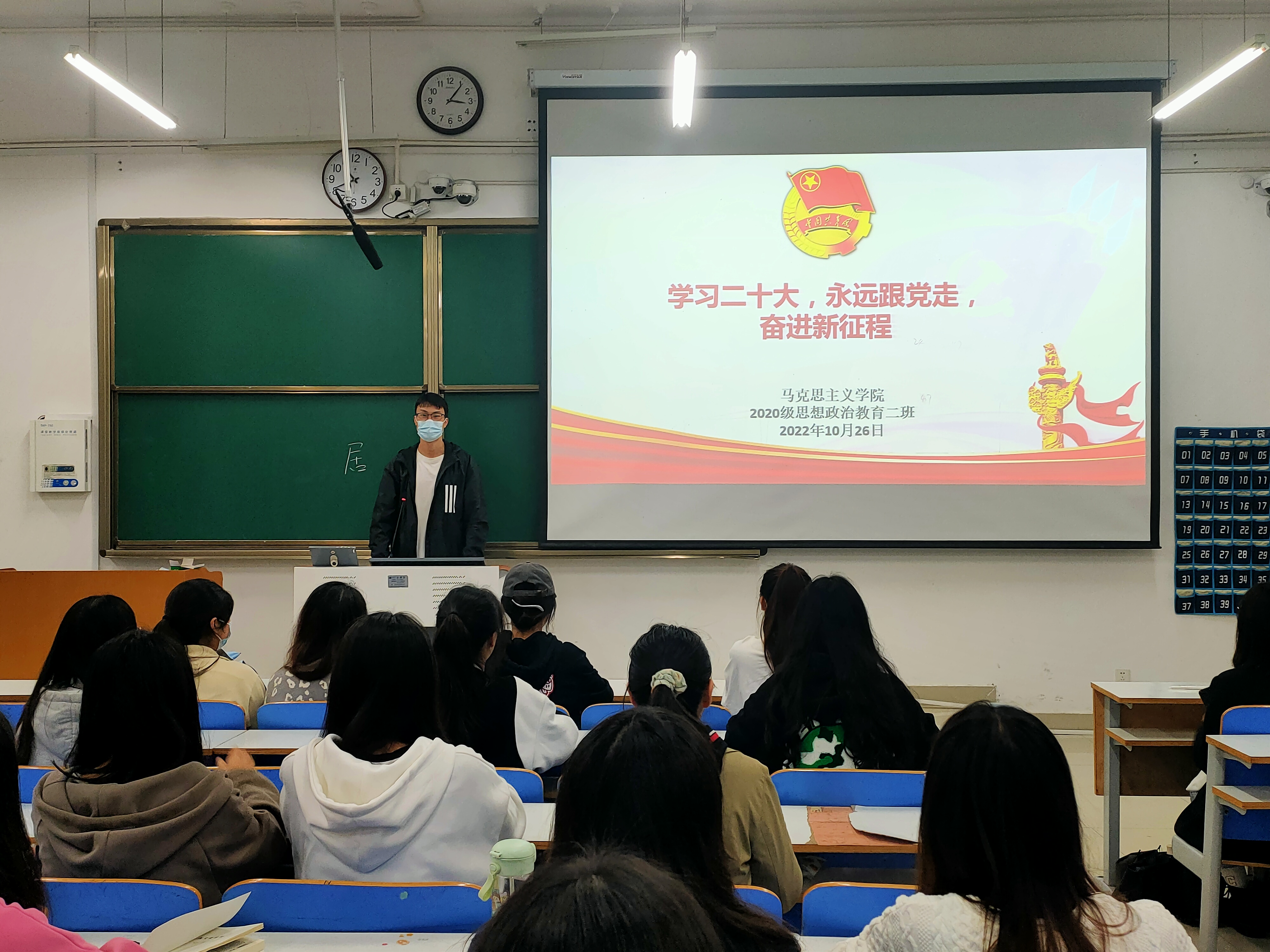 为深入学习贯彻中国共产党第二十次全国代表大会重要会议精神,10月26日下午,pp电子官方网站2020级思想政治教育二班、定向二班在社科楼415教室召开“学习二十大,永远跟党走,奋进新征程”主题班会。二班、定向二班全体学生共同参与本次班会。班会由团支书陈宇航主持。