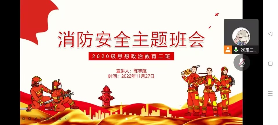 11月27日晚,pp电子官方网站2020级思想政治教育二班通过腾讯会议召开线上消防安全主题班会。2020级思想政治教育二班全体学生共同参与本次班会。班会由团支书陈宇航主持。