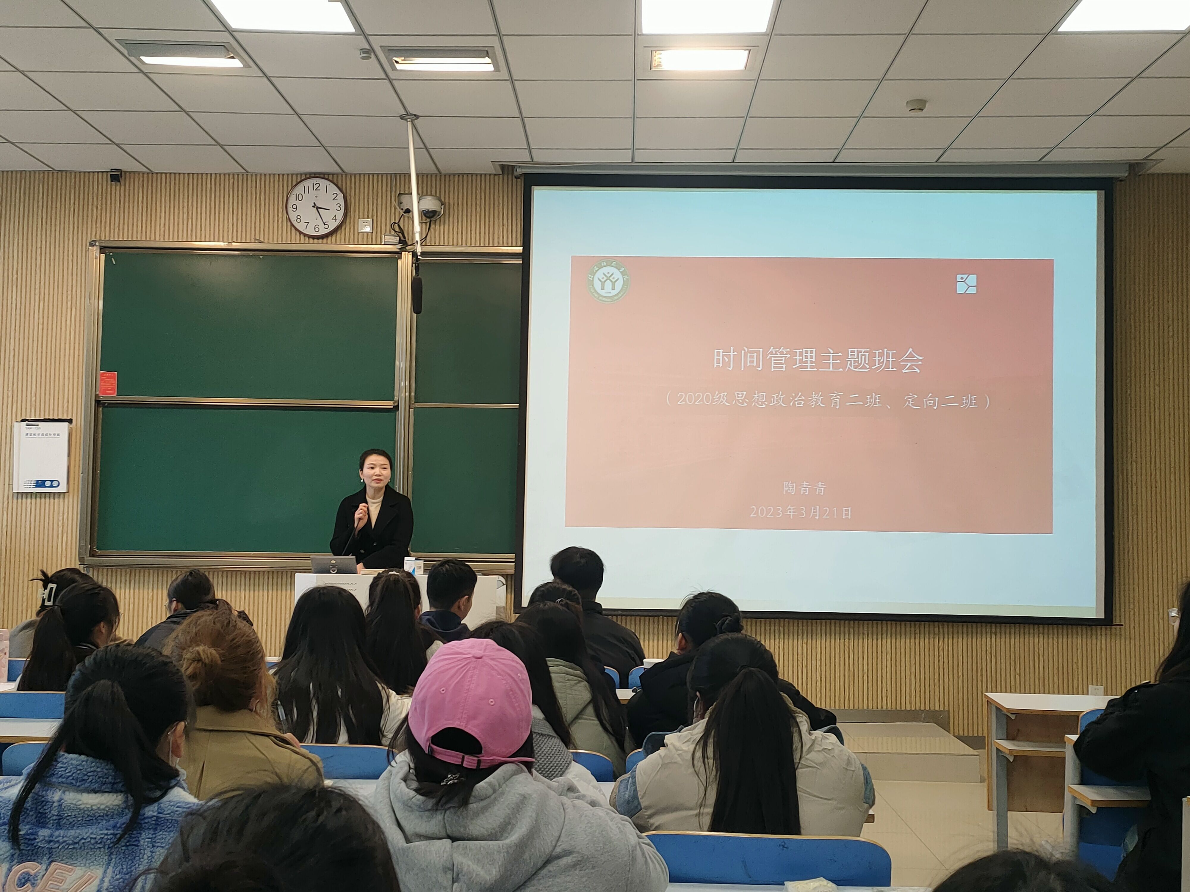 3月21日下午,pp电子官方网站2020级思想政治教育二班、定向二班在社科楼515教室召开时间管理主题班会。辅导员陶青青、二班、定向二班全体同学共同参会。班会由陶青青主持。