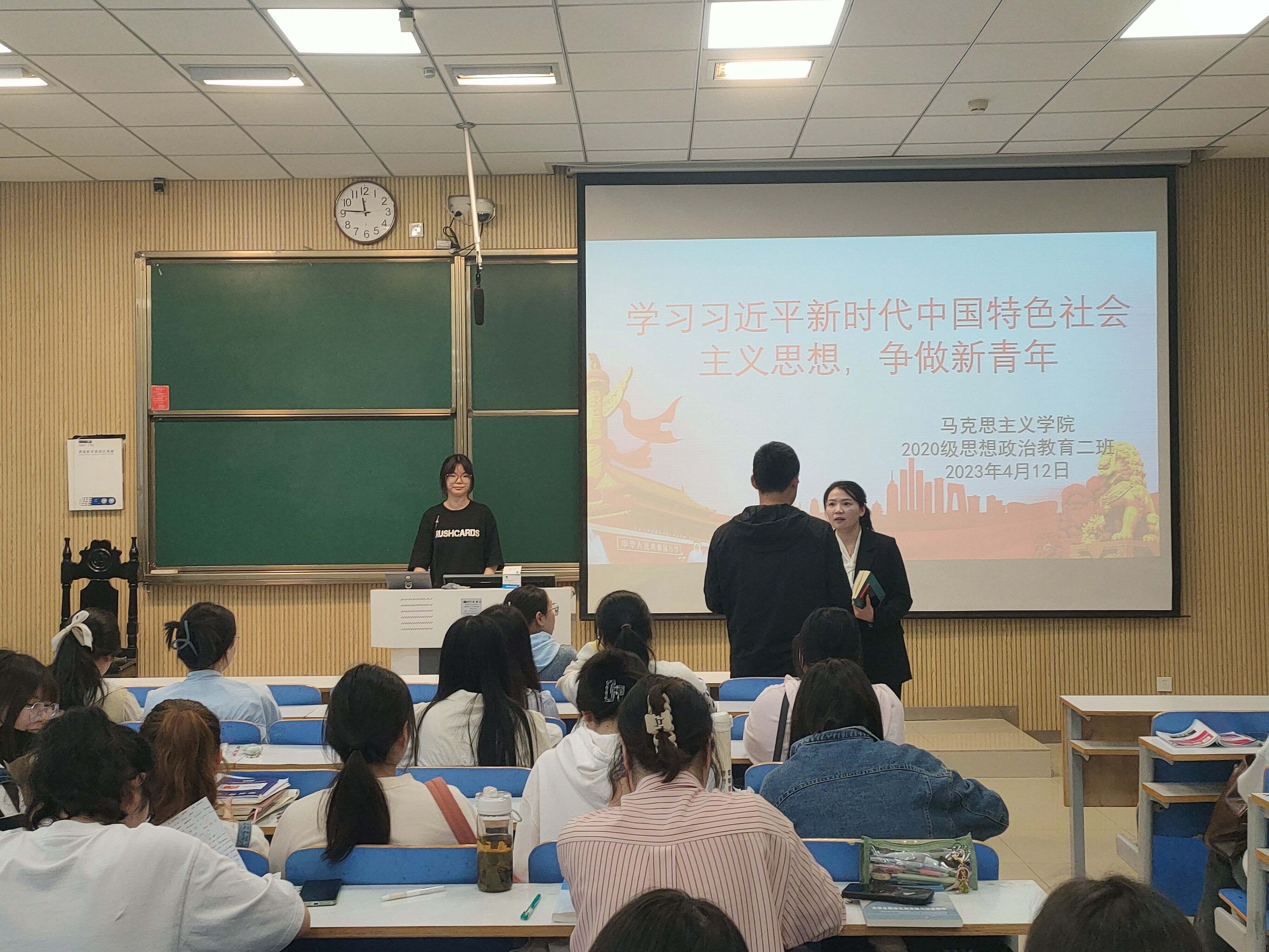 感悟思想伟力,凝聚奋进力量。为积极响应我校关于开展学习宣传贯彻习近平新时代中国特色社会主义思想主题教育的通知要求,推动我班理论学习进一步走深走实,4月12日上午,pp电子官方网站2020级思想政治教育二班、定向二班团支部在社科楼515教室开展“学习习近平新时代中国特色社会主义思想,争做新时代青年”主题团课。二班、定向二班全体团员共同参与此次团课。团课由团支书李晨曦讲授。