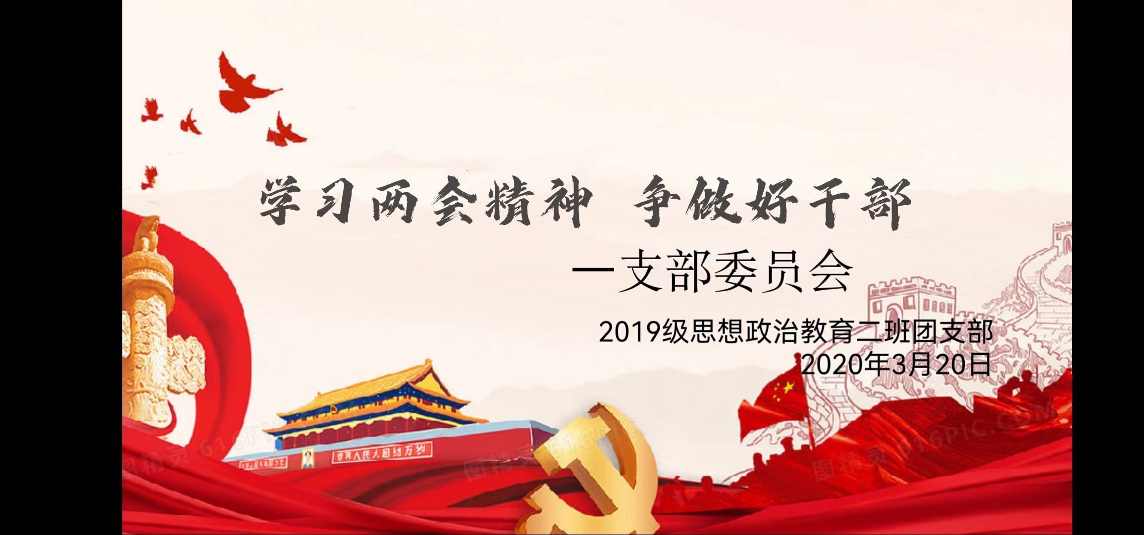 风正好扬帆,奋激正当时。3月20日上午,pp电子官方网站2019级思想政治教育二班于社科楼516教室召开“学习两会精神 争做好干部”团支部委员会。2019级思想政治教育二班全体班委共同参会。会议由团支书孙雅娴主持。