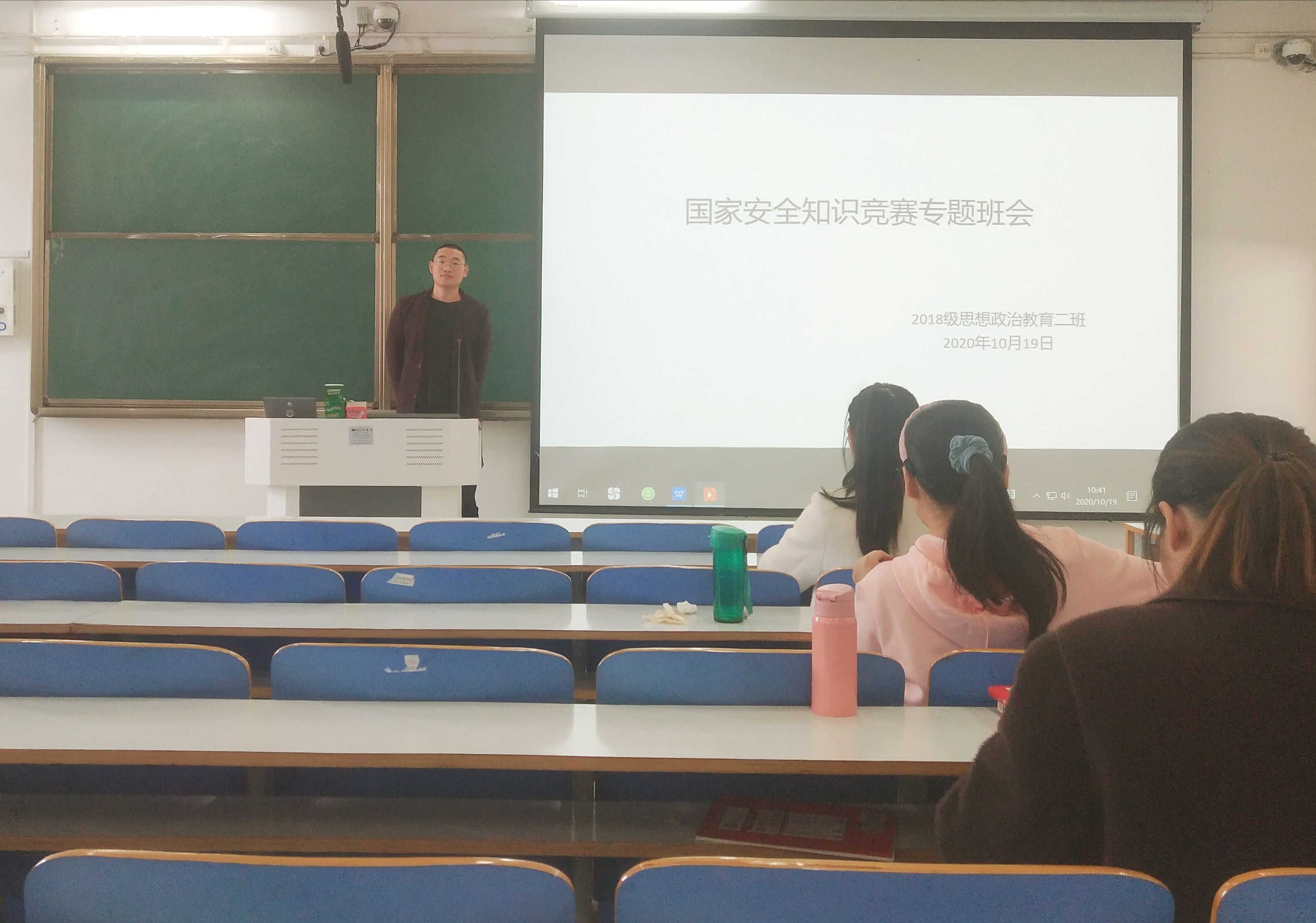10月19日上午,pp电子官网2018级思想政治教育二班在社科楼514教室顺利开展“国防安全知识竞赛”专题班会。2018级思想政治教育二班全体成员共同参加了此次班会。会议由班长杨康主持。