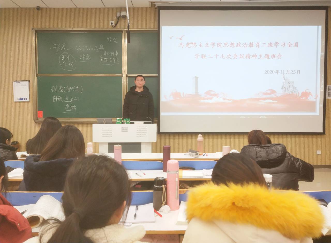 11月25日上午,pp电子官方网站2018级思想政治教育二班在社科楼515教室顺利开展学习中华全国学生联合会第二十七次代表大会精神主题班会。会议由班长杨康主持。