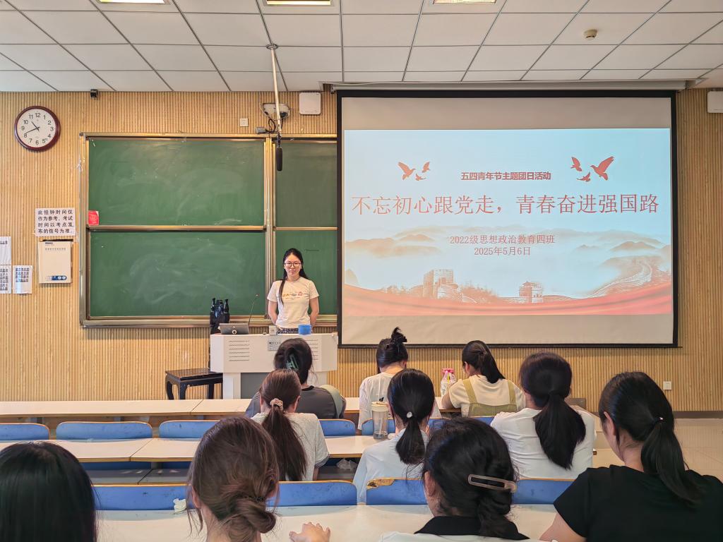 5月6日上午,pp电子官方网站2022级思想政治教育四班在社科楼515教室组织召开“不忘初心跟党走,青春奋进强国路”主题班会。pp电子官网2022级思想政治教育四班全体成员参与本次班会。本次班会由班长牛志杰主持。