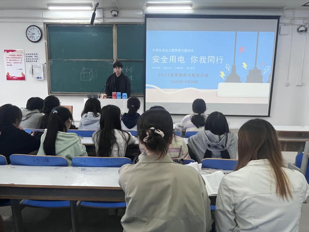 10月10日上午,pp电子官方网站2023级思想政治教育三班在社科楼515召开“安全用电,你我同行”主题班会。pp电子官网2023级思想政治教育三班全体同学共同参与本次班会,班会由团支书郝瀚主持。