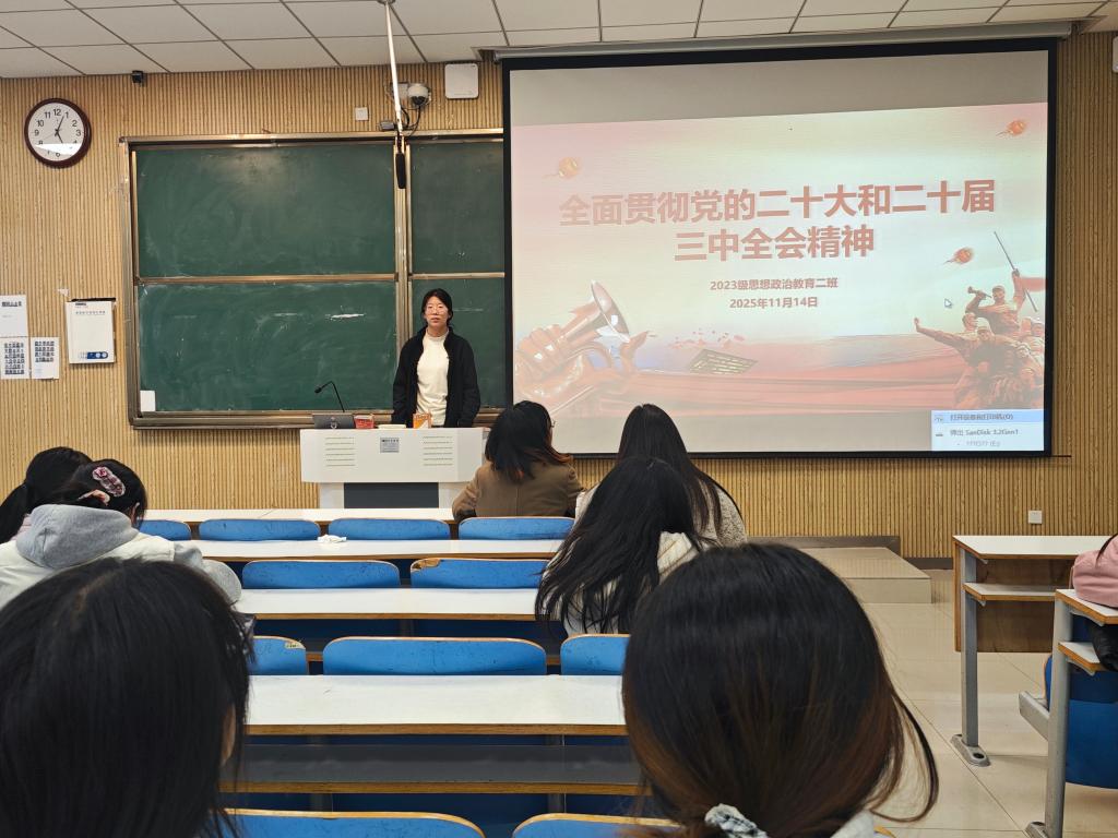 为进一步在班级内弘扬党的思想,贯彻党的路线,11月14日上午,pp电子官方网站2023级思想政治教育二班在社科楼515教室开展“全面贯彻党的二十大和二十届三中全会精神”主题团课,本次团课由团支书王慜初主持,全体二班同学参加。