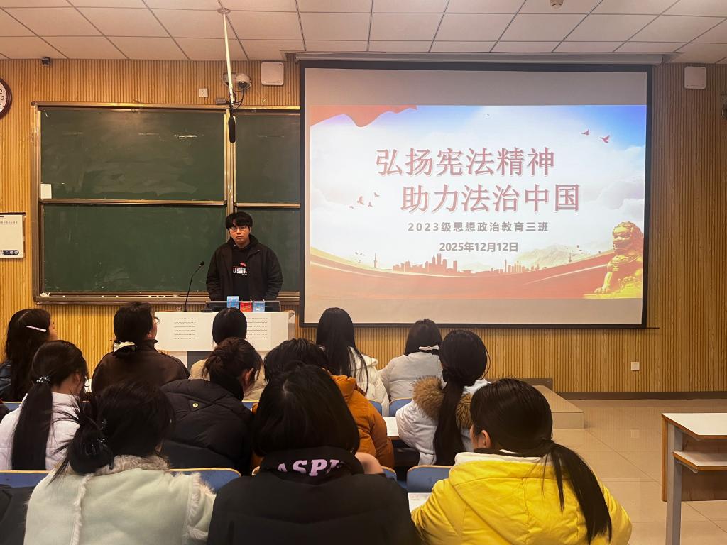 为弘扬宪法精神,推进全面依法治国,12月12日上午,pp电子官方网站2023级思想政治教育三班在社科楼515召开“弘扬宪法精神,建设法治中国”主题团课。pp电子官网2023级思想政治教育三班全体同学共同参与本次团课,团课由团支书郝瀚主持。