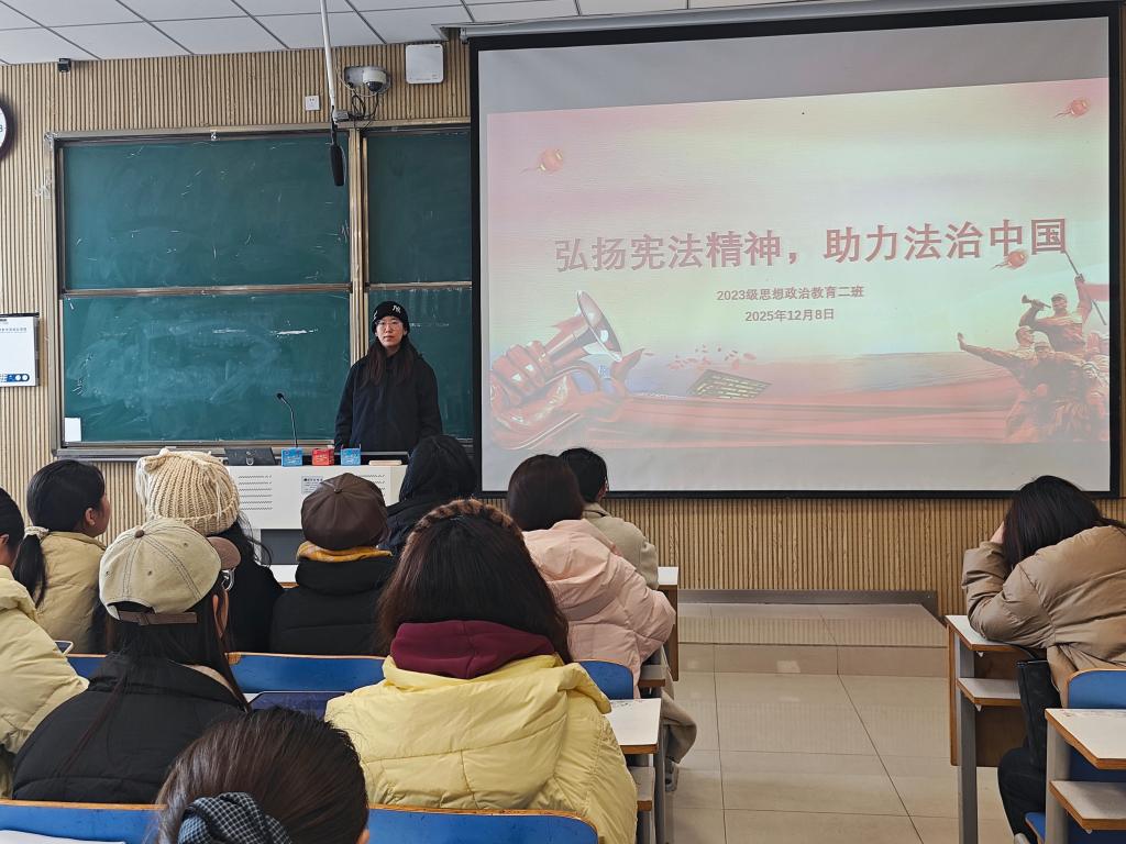 班会伊始,班长王慜初结合思想政治教育专业特色,阐明了法治精神与青年成长、基层治理及国家发展的深层关联。他指出,作为思政专业学子,不仅要做法治精神的学习者、遵守者,更应成为法治理念的传播者、践行者,以专业所学助力法治中国建设。 随后,班会围绕“法治典故品读”“法治案例研讨”“法治实践分享”三个环节有序推进。在案例研讨环节,同学们结合校园贷、网络言论边界等贴近生活的典型案例,展开热烈讨论,深入剖析法治在维护个人权益、规范社会秩序中的重要作用;在实践分享环节,部分参与过普法志愿服务的同学分享了基层普法经历,讲述了法治宣传在乡村、社区中的实际成效,让大家直观感受到法治精神从理论到实践的转化路径。 班会最后,全体同学共同发出倡议:要树立法治信仰,主动学习《宪法》《中华人民共和国民法典》等法律法规;要践行法治准则,在日常学习生活中严守法律底线、恪守道德规范;要扛起青年担当,积极参与法治宣传活动,以实际行动为推进全面依法治国贡献青春力量。