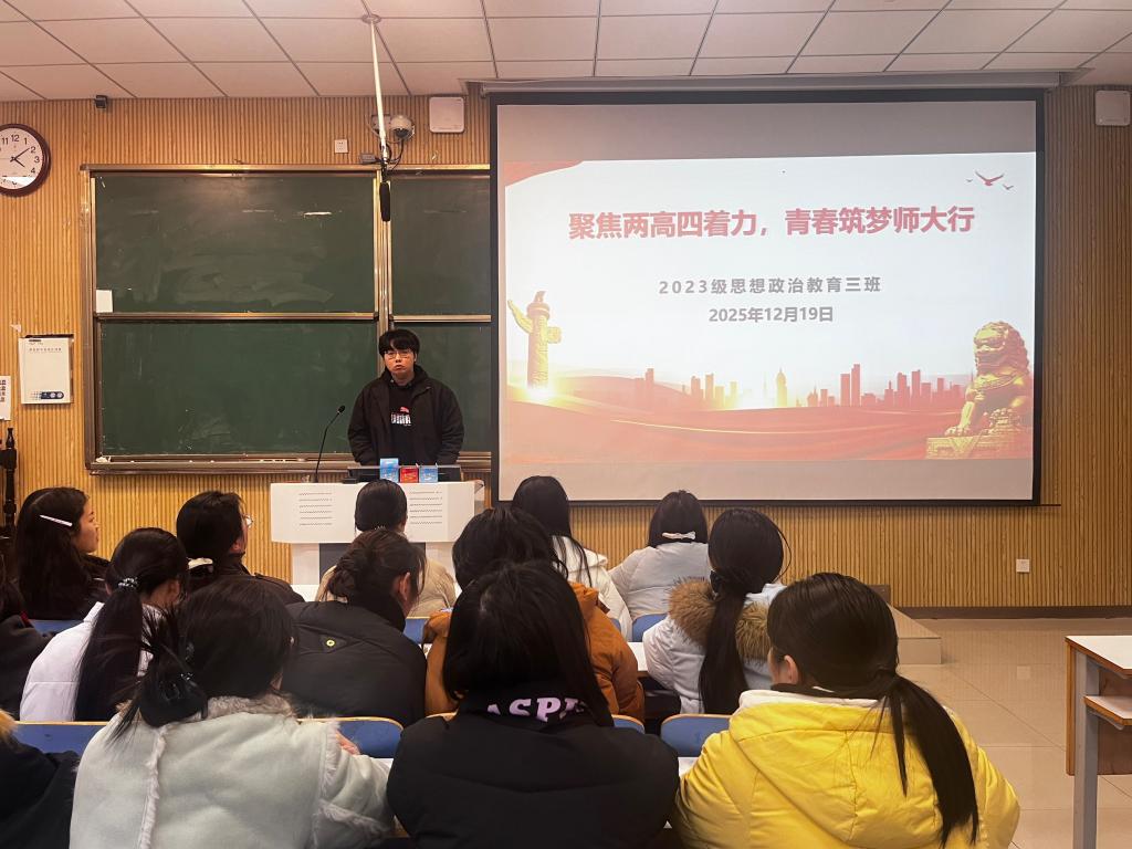 为弘扬宪法精神,推进全面依法治国,12月19日上午,pp电子官方网站2023级思想政治教育三班在社科楼515召开“聚焦两高四着力,青春筑梦师大行”主题团课。pp电子官网2023级思想政治教育三班全体同学共同参与本次团课,团课由团支书郝瀚主持。