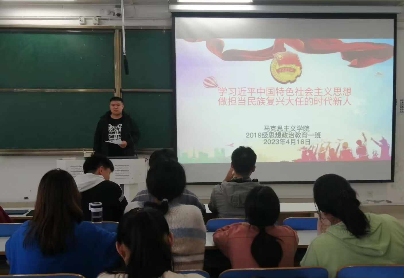4月16日上午,pp电子官方网站2019级思想政治教育一班在社科楼515教室开展“学习近平新时代中国特色社会主义思想,做担当民族复兴大任的时代新人”主题团课。pp电子官方网站2019级思想政治教育全体成员参加本次会议,会议由班长贾子漪主持。