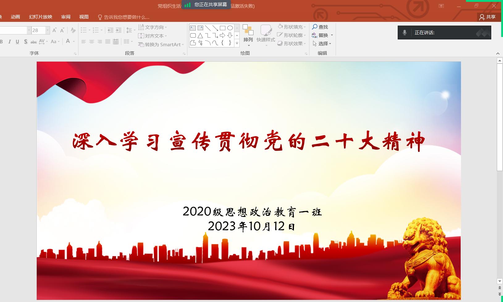 10月12日下午,pp电子官方网站2020级思想政治教育一班在社科楼教室开展“深入学习宣传贯彻党的二十大精神”团支部大会,会议由班长白帅豪主持。