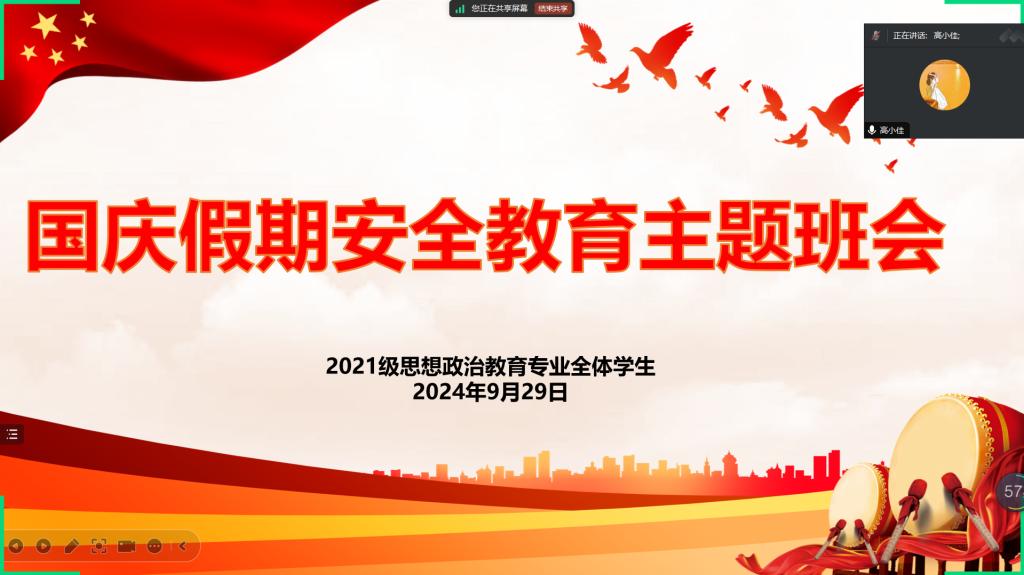 9月29日下午,pp电子官方网站2021级思想政治教育一班、二班在腾讯会议召开“国庆假期安全教育”主题班会。辅导员高小佳及全体成员共同参加,班会由辅导员高小佳主持。