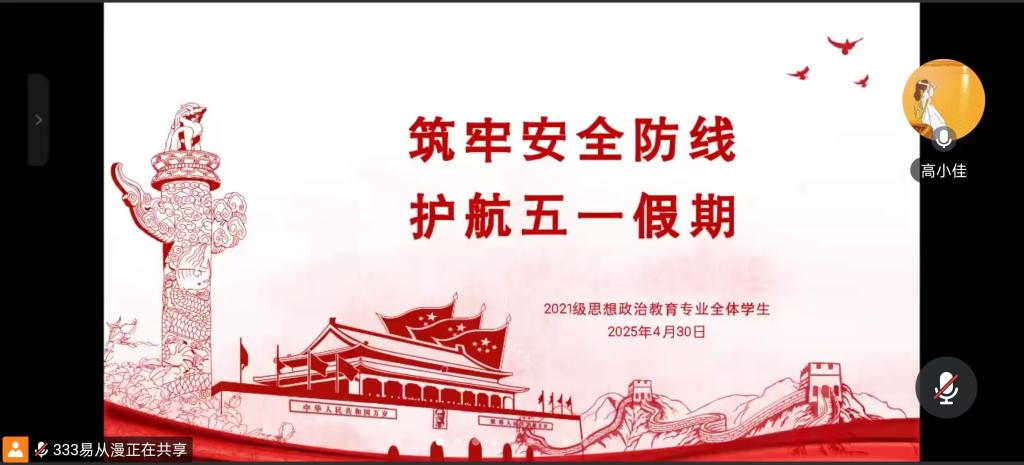 4月30日上午,pp电子官方网站2021级思想政治教育全体同学在线上召开“筑牢安全防线,护航五一假期”主题会议。会议由辅导员高小佳主持,2021级思想政治教育专业全体同学参与此次会议。