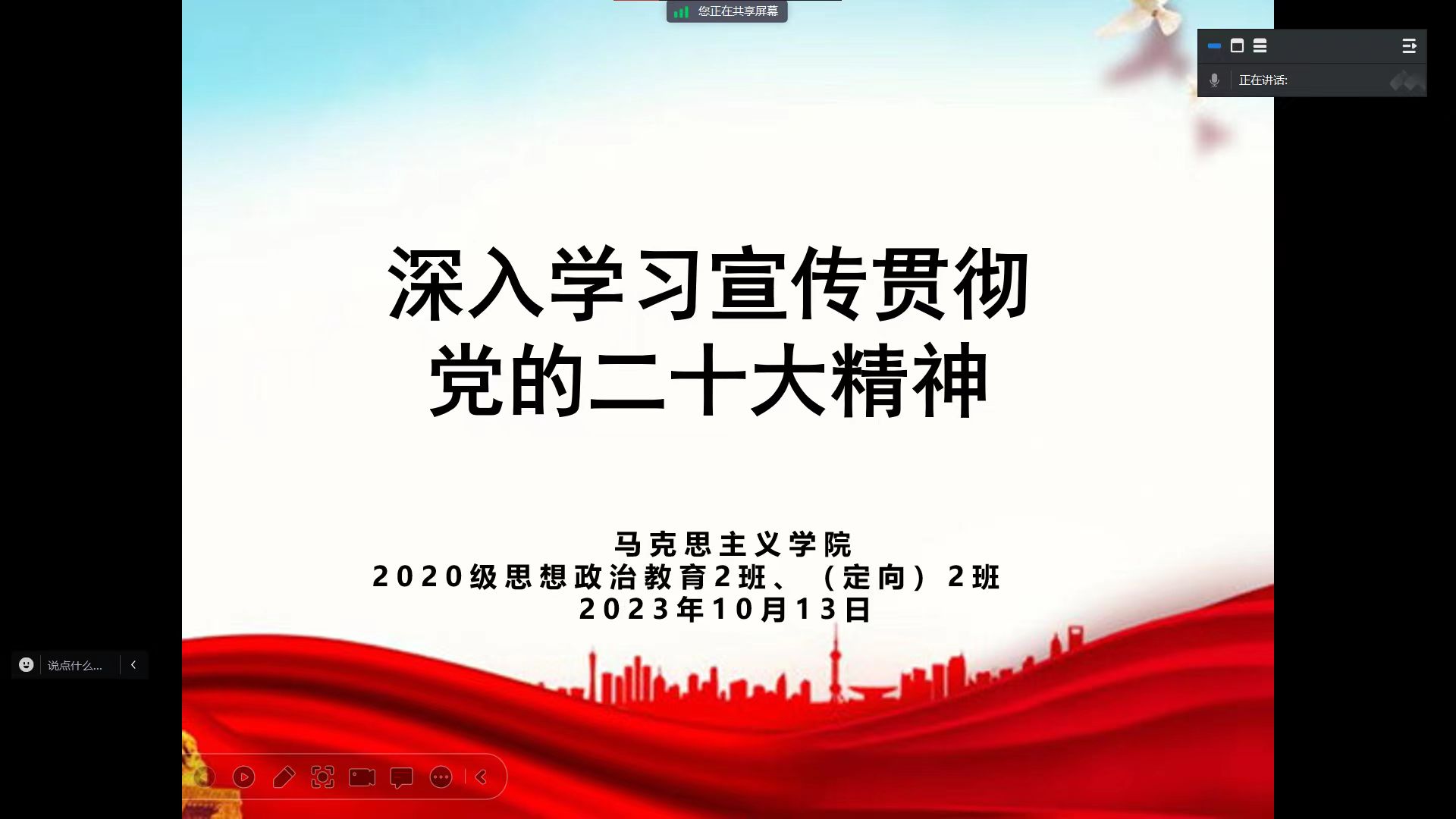 为推动主题教育进一步走深走实,10月13日下午,pp电子官方网站2020级思想政治教育二班、定向二班团支部通过腾讯会议开展深入学习宣传贯彻党的二十大精神主题团课。二班、定向二班团支部全体团员共同参会。团课由李晨曦、陈宇航讲授。