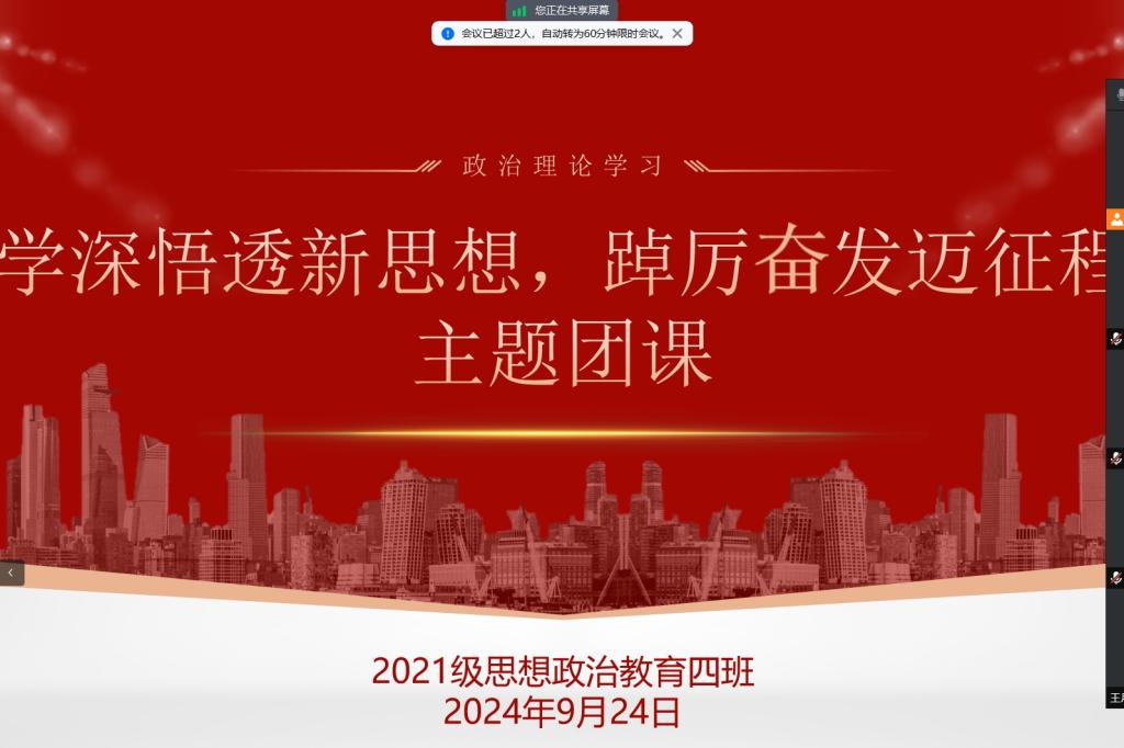 9月24日上午,pp电子官方网站2021级思想政治教育四班在腾讯会议开展“学深悟透新思想,踔厉奋发迈征程”主题团课。2021级思想政治教育四班全体学生共同参加本次团课。团课由团支书刘珂含主持。
