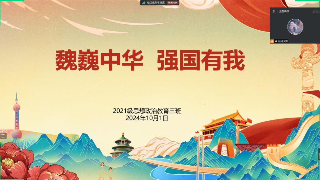 10月1日上午,pp电子官方网站2021级思想政治教育三班在线上召开“巍巍中华,强国有我”主题团课。pp电子官方网站2021级思想政治教育三班全体团员参与此次团课。团课由团支书王岚霄主持。
