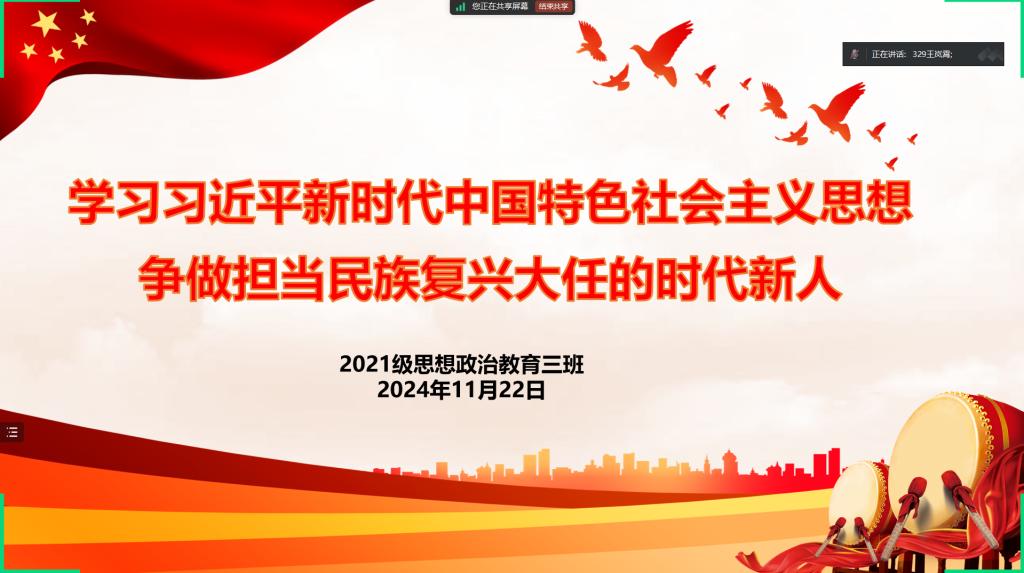 11月22日下午,pp电子官方网站2021级思想政治教育三班在线上召开“学习习近平新时代中国特色社会主义思想,争做担当民族复兴大任的时代新人”主题团课。pp电子官方网站2021级思想政治教育三班全体团员参与此次会议。会议由团支书王岚霄主持。